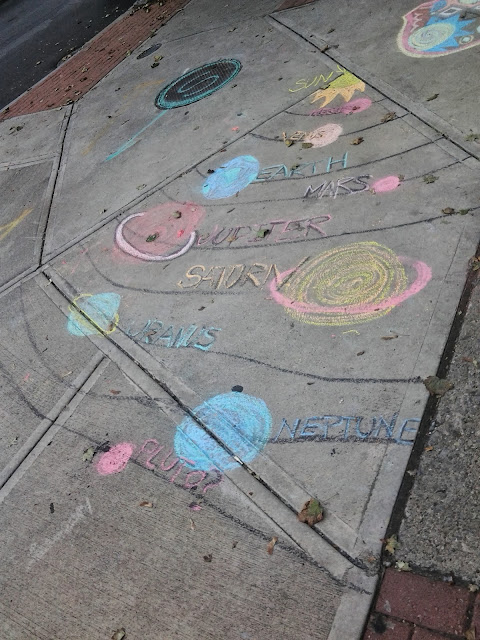 Our Solar System (even non-planet Pluto) sketched in chalk on a sidewalk in the Hudson/Park neighborhood.