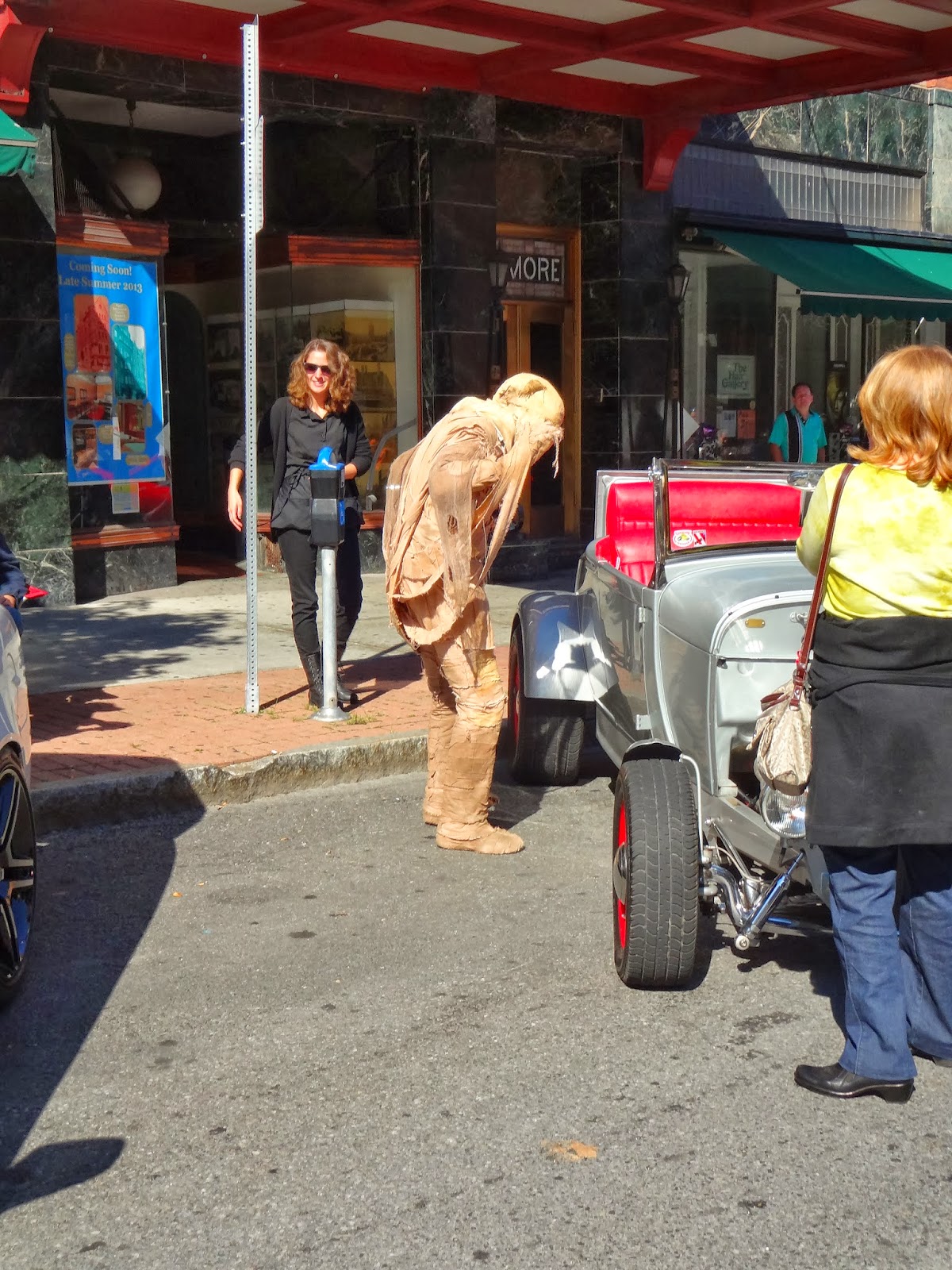 An Ancient Egyptian mummy pauses to check out a vintage vehicle on display at Saturday's classic car show on North Pearl Street.